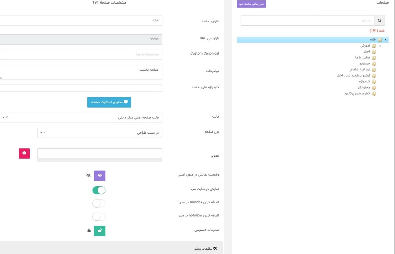 درخت صفحات: صفحات ایجاد شده و سلسلهمراتب آنها را به صورت فهرست درختی نمایش میدهد. این بخش در سمت راست رابط کاربری قرار گرفته و شامل فیلدی برای جستجوی سریع در میان صفحات است. کاربران میتوانند با استفاده از این ناحیه، به راحتی بین صفحات مختلف پیمایش کرده و ساختار سلسلهمراتبی سایت را مشاهده نمایند. همچنین امکان فیلتر کردن صفحات بر اساس عنوان یا کلمات کلیدی نیز در این بخش فراهم شده است.